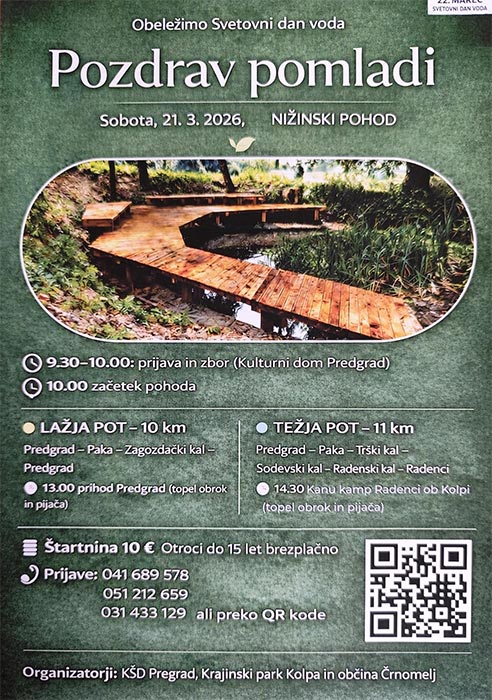 Vabimo vas, da se nam v soboto pridružite na pohodu po prelepi Poljanski dolini ob Kolpi. Tiste, ki boste izbrali daljšo pot vabimo, da se ob 9.00 zberete v Radencih ob Kolpi, da se skupaj z avtobusom odpeljemo na start v Predgrad. V Radence se bomo vrnili ob cca. 14. uri, pohodnike pripada malica, ob 15.00 pa vas vabimo, da prisluhnete predavanju o Kalih v Kanu kamp Radenci.