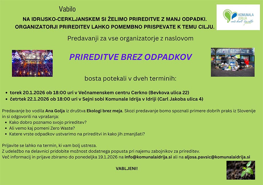 Trajnostni turizem se začne pri odločitvah – tudi pri organizaciji prireditev. Zato Komunala Idrija vabi vse organizatorje prireditev na delavnico o organiziranju prireditev brez odpadkov.