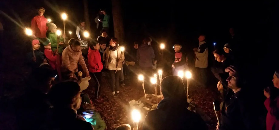 Po zboru si bomo prižgali bakle ter odšli v smeri zaselka Podšteberk, kjer se bomo sprehodili do izvira Štebrški obrh ter se nato povzpeli do ostankov ruševin gradu Šteberk. Ob soju bakel bomo prisluhnili zgodbi o nastanku Cerkniškega jezera. Pot nas bo nato po gozdni poti vodila nazaj do kmetije s nastanitvijo Tekavča ograda. Po povratku se bomo pogreli ob skodelici čaja in pečenim kostanjem (prostovoljni prispevki).