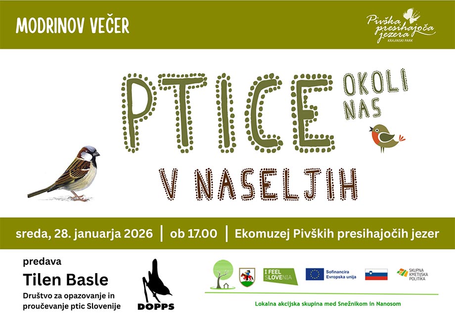 Prvi modrinov večer v letu 2026 bo tako namenjen predstavitvi same akcije in vabilu k sodelovanju pri popisu. Za izvedbo popisa predhodno znanje ni potrebno, v pomoč vam bo letak za opazovanje. Poleg tega nam bo predavatelj Tilen Basle, varstveni ornitolog in direktor pisarne društva, predstavil tudi pestrost ptic na Pivškem. Predavanje bo v sredo, 28. januarja 2026, ob 17. uri v Ekomuzeju Pivških presihajočih jezer.