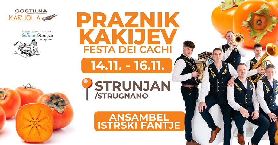 V sodelovanju s Turističnim društvom Solinar Strunjan vas vljudno vabimo na Praznik Kakijev 2025. Pestro kulinarično in glasbeno dogajanje bo na sporedu od petka, 14. novembra, do nedelje, 16. novembra v šotoru na velikem asfaltnem parkirišču v Strunjanu. Vabljeni na slastno kulinariko, dobro kapljico, pester glasbeni program, kjer bodo osrednja točka Ansambel Istrski Fantje in seveda vabljeni na KAKIJE!